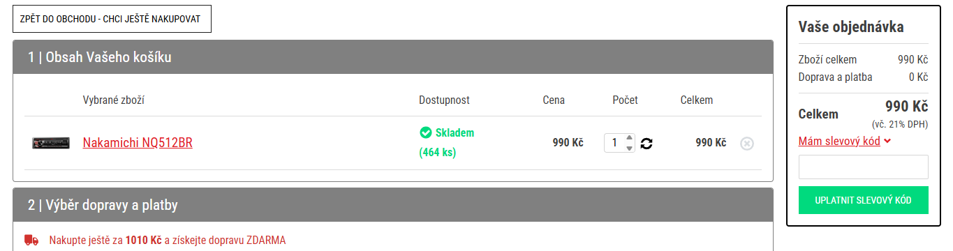Vyberte si zboží, které vás zaujalo, a přidejte ho do košíku. Poté přejděte do košíku a v pravé části stránky klikněte na možnost „Mám slevový kód“. Do zobrazeného pole zadejte svůj kód a potvrďte ho tlačítkem „Uplatnit slevový kód“. Sleva se automaticky odečte z celkové částky. Následně dokončete objednávku obvyklým způsobem.