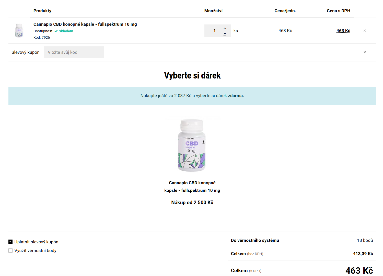 Tento e‑shop nabízí široký výběr prémiových CBD a CBG produktů, včetně olejů, kapslí, květů, semen, potravin i kosmetiky s obsahem konopí, pečlivě vybraných pro každodenní péči. Při nákupu můžete využít Cannapio slevový kód, díky kterému pořídíte své oblíbené produkty za výhodnější cenu. Pokud navíc vaše objednávka přesáhne určitou hodnotu, získáte dopravu zdarma. Pravidelné akční nabídky dostupné v sekci Akce nabízejí další možnosti, jak ušetřit. A jestliže se na e-shopu zaregistrujete, budete se moci zapojit do věrnostního programu, kde sbíráte body za nákupy a další aktivity. Nasbírané body následně jednoduše využijete jako slevu při další objednávce.