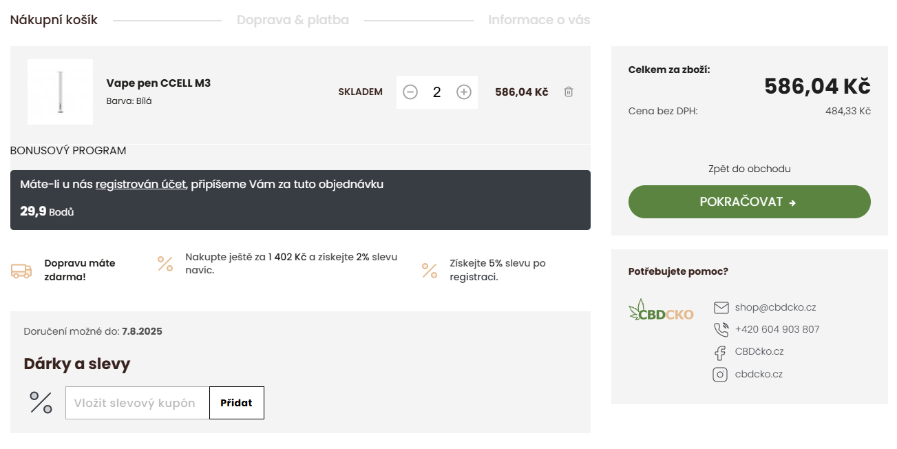 CBDčko je e‑shop zaměřený na kvalitní konopné produkty, mezi které patří CBD oleje, květy, kapsle, CBG i HHC doplňky. Při nákupu na e-shopu můžete využít CBDčko slevový kód a pořídit si vybrané produkty za výhodnější cenu. Pokud se zaregistrujete, získáte přístup k věrnostnímu programu s odměnami za nákupy a exkluzivními nabídkami. Výhodou je také doprava zdarma při objednávkách nad určitou hodnotu. V e‑shopu nechybí ani sekce výprodejů a sezonní speciální akce, díky nimž můžete ušetřit ještě více.