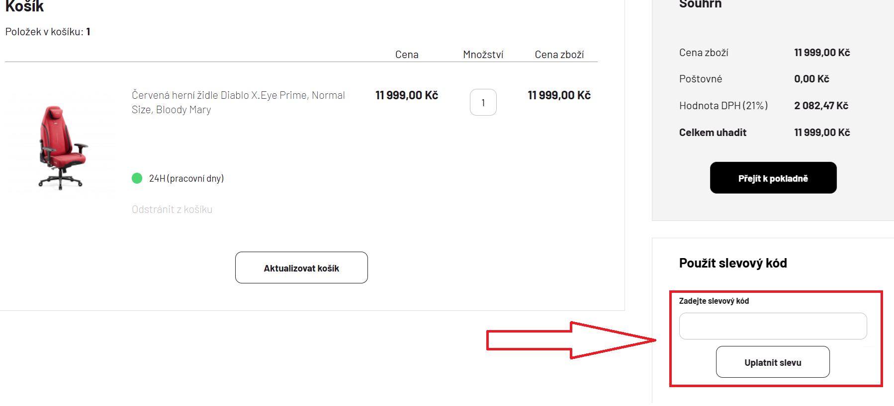 Vyberte si zboží, které chcete nakoupit, a vložte ho do košíku. V košíku najdete kolonku "Zadejte slevový kód". Do této kolonky vložte zkopírovanou slevu. Klikněte na tlačítko "Uplatnit slevu". Pokud je kód platný a splňujete podmínky, sleva se vám automaticky odečte od ceny nákupu.