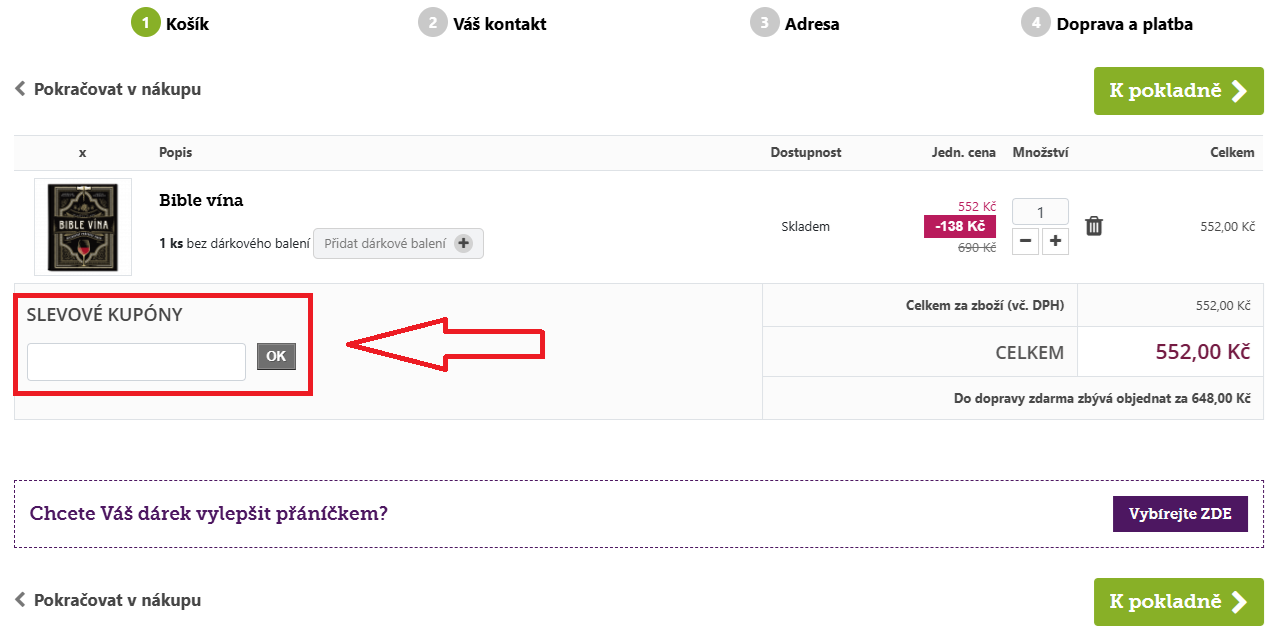 V e-shopu si vyberte zboží, které chcete zakoupit a vložte ho do košíku. Pod souhrnem objednávky vyplňte kolonku „Slevové kupony“ a poté klikněte na tlačítko „OK“. Celková částka vaší objednávky se automaticky upraví a hodnota slevového kódu se odečte. Poté už zbývá pouze dokončit objednávku.