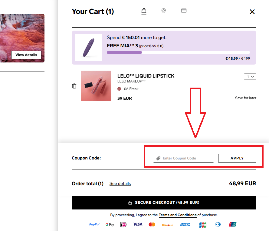 Proklikejte se z košíku do pokladny. Pod vybranými produkty zde uvidíte políčko pro vložení slevového kódu. Zadejte svůj kód a potvrďte ho tlačítkem „Apply“. Sleva se ihned odečte z celkové částky. Poté dokončete objednávku obvyklým způsobem.