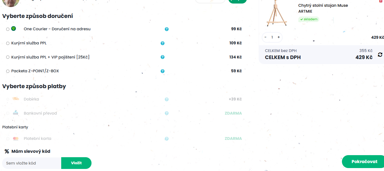 Vyberte si produkt, o který máte zájem a vložte jej do košíku. V prvním kroku objednávky do kolonky „Mám slevový kod“ opište kód slevy nebo akce, kterou chcete uplatnit a potvrďte tlačítkem „Vložit“. Tak se Artmie sleva aktivuje. Následně dokončete svoji objednávku.