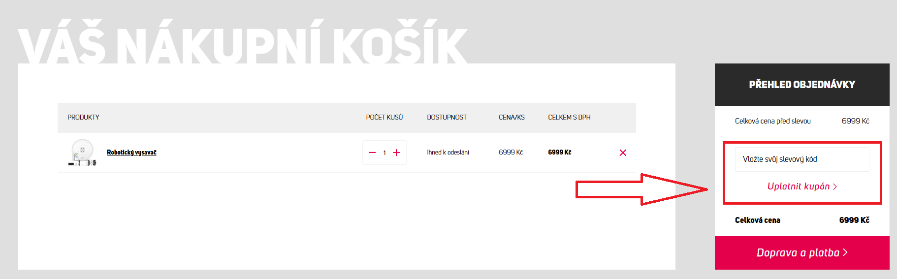 Celkovou cenu své objednávky můžete snížit pomocí slevových kuponů. Stačí jednoduše vložit kód v košíku do příslušné kolonky a ušetříte.